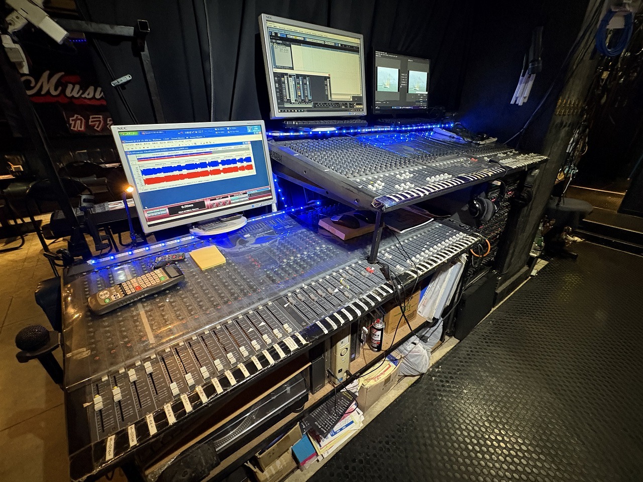 もうひとつ特筆すべきはその音響機材の種類と量がすごくて、音響マンがスタジオやるとこうなるのか!と驚くしかありませんでした。Marshallのアンプやスピーカー、JBLのスピーカーなどド迫力のラインナップにミキサーも2個重なってました。